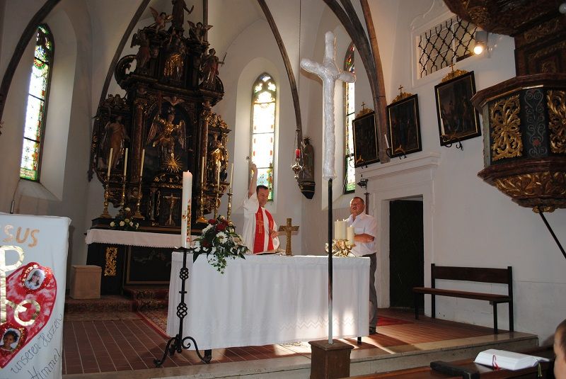 Am 10. August des heurigen Jahres war es dann soweit und die Montage des reparierten Kirchturmkreuzes erfolgte. Dazu wurde eine Segnung des Kreuzes in der Kirche durch Pater Laurentius unter reger Anteilnahme der Bevölkerung veranstaltet. Es gibt auch eine Urkunde zu diesem feierlichen Anlass.