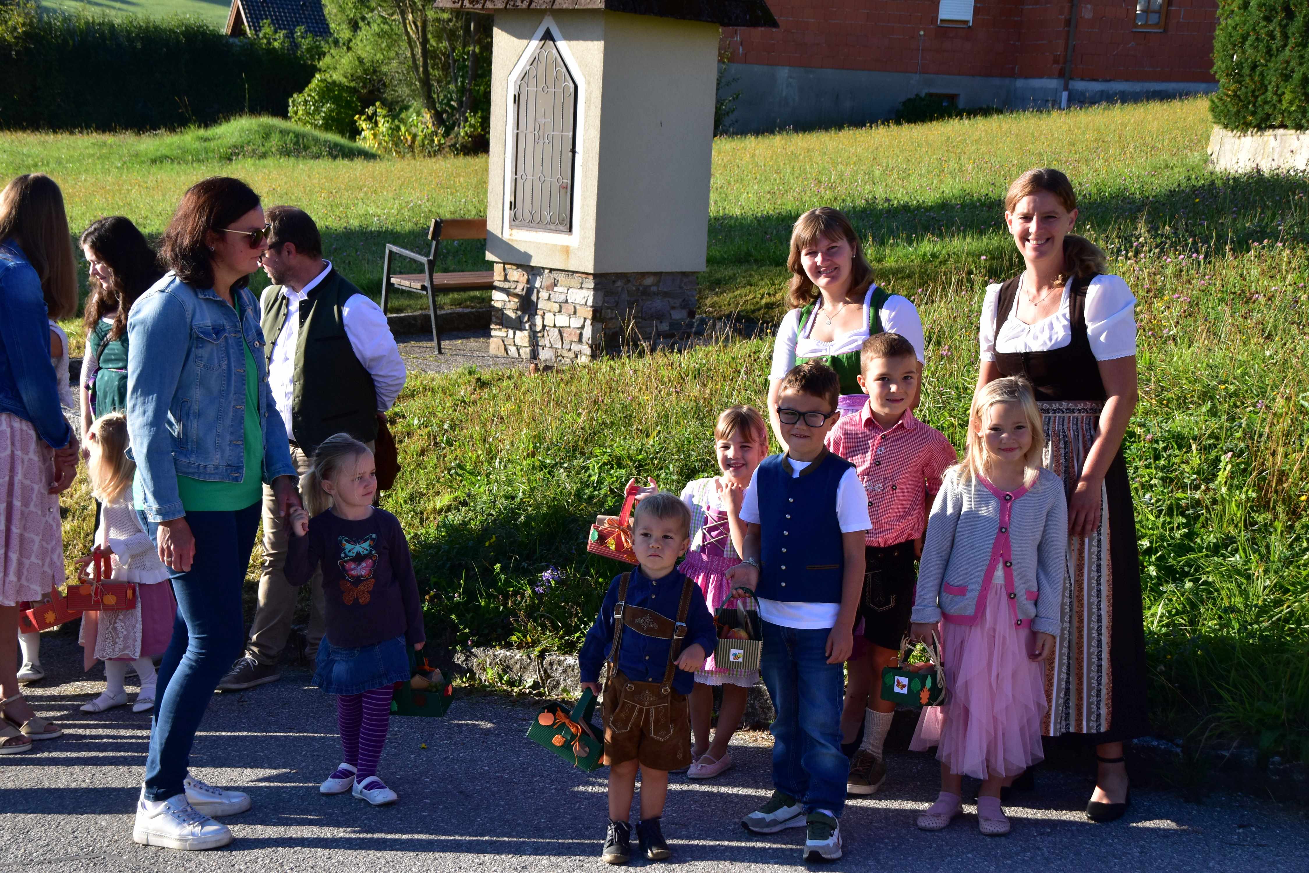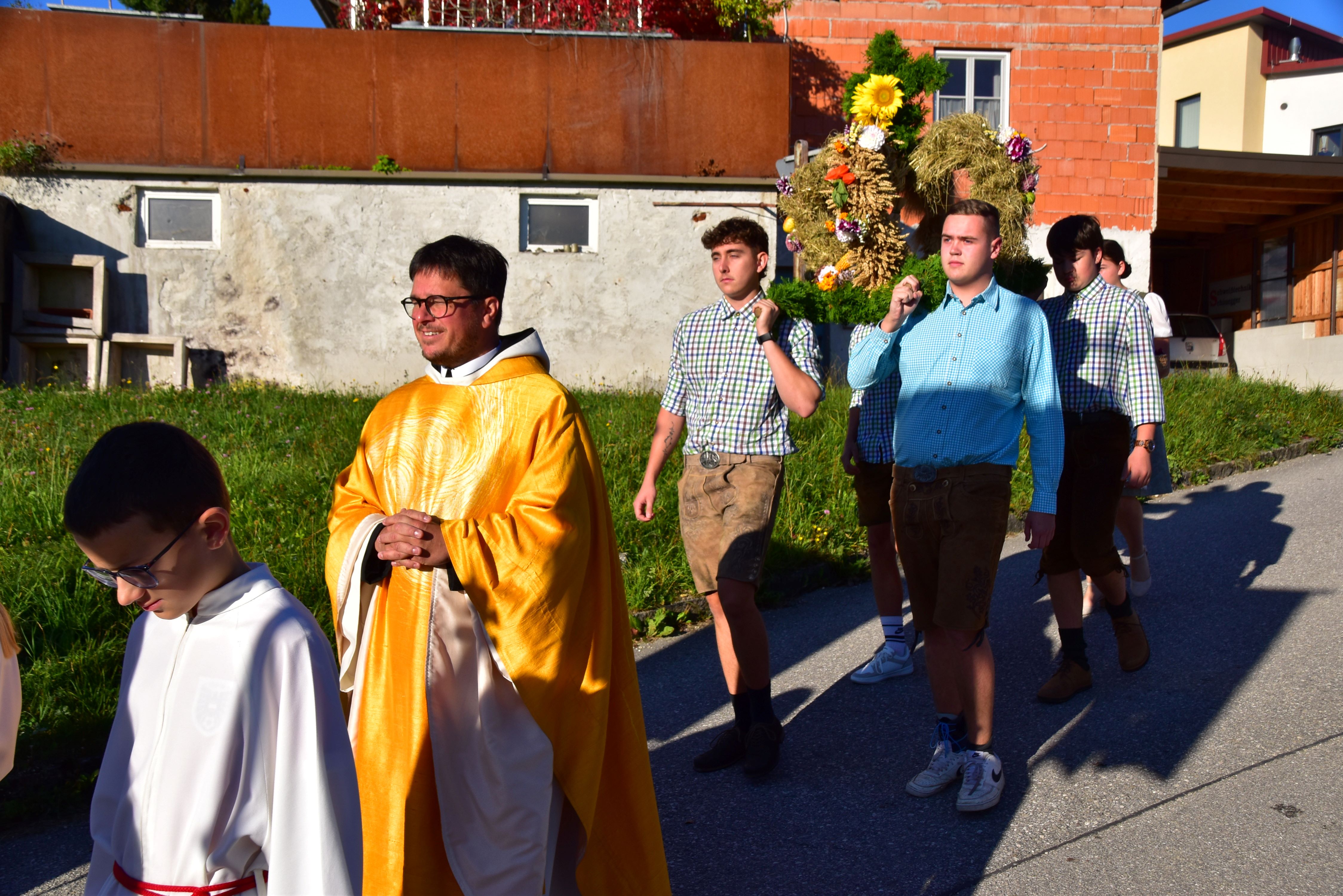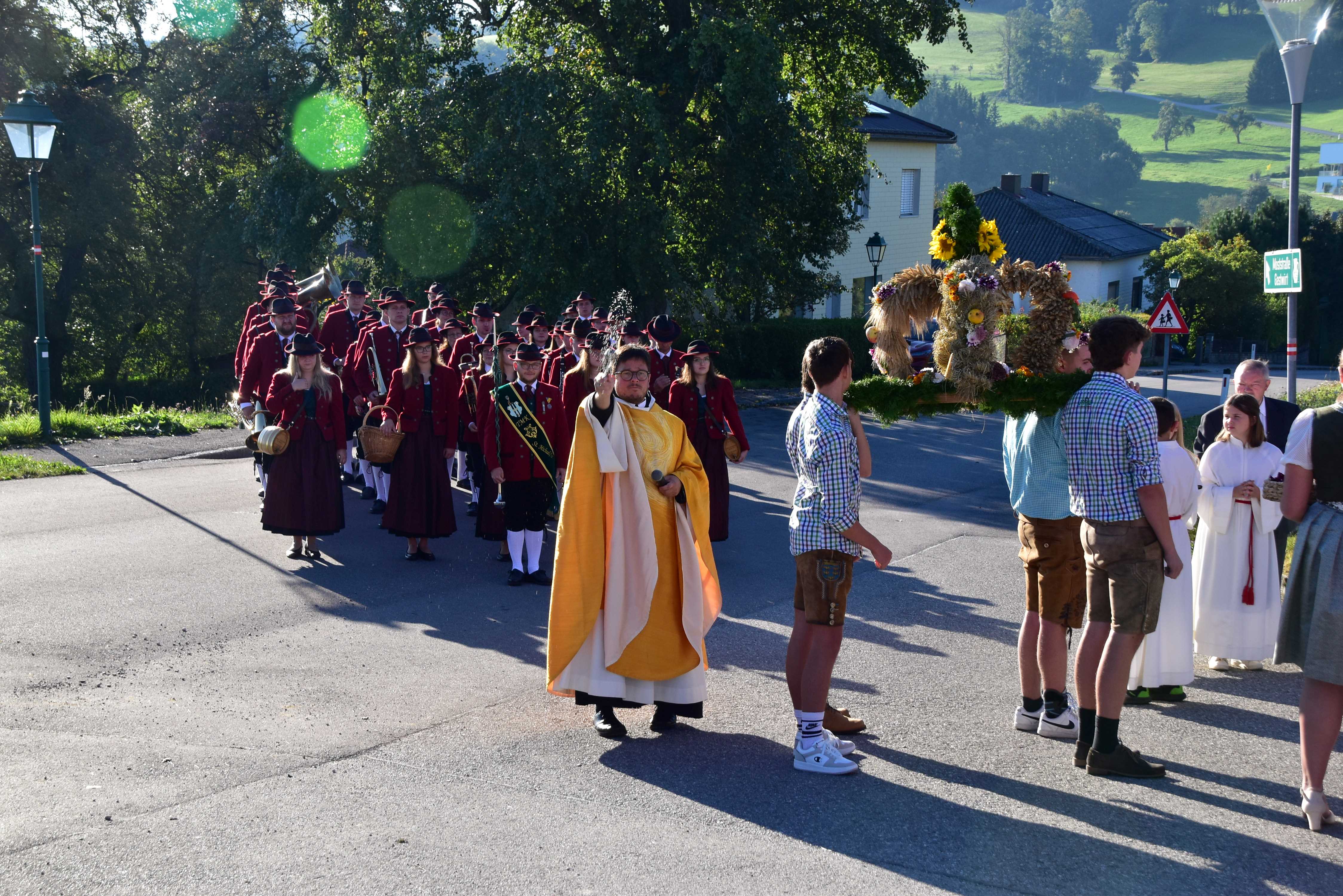 Bei strahlend schönem Spätsommerwetter feierte die Pfarre St. Michael das Erntedankfest. Auf Pater Florian und die von der KLJ wunderschön gebundene Erntekrone warteten bei der Mitterböckkapelle schon viele Messbesucher, darunter auch viele Kinder und die Trachtenmusikkapelle St. Michael, die den Festzug mit der Erntekrone musikalisch in die Kirche begleitete. Die Kindergartenkinder brachten ihre Erntekörbchen zum Altar und beteiligten sich mit dem Lied: "Hast du heute schon danke gesagt?" eifrig an der Hl. Messe.