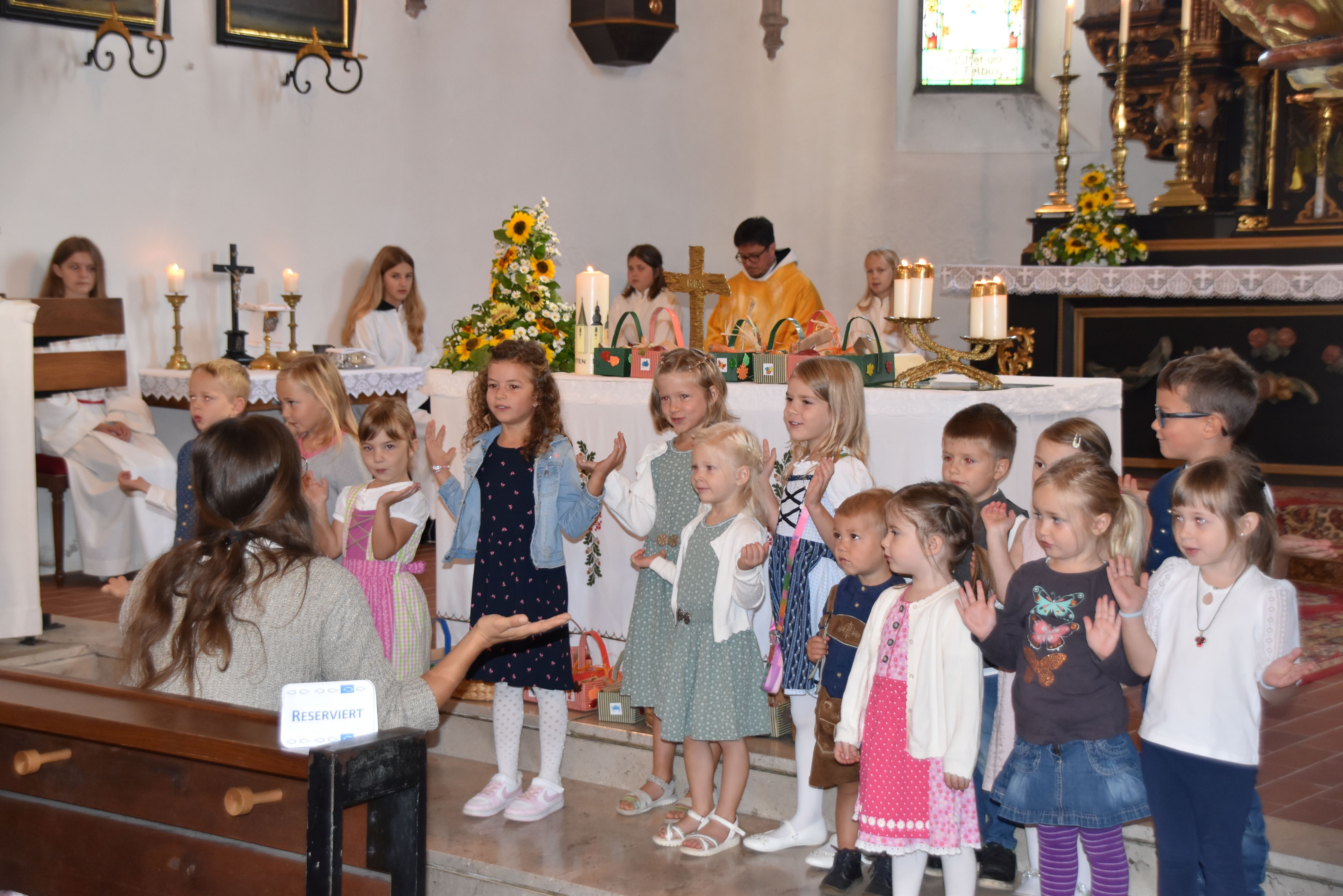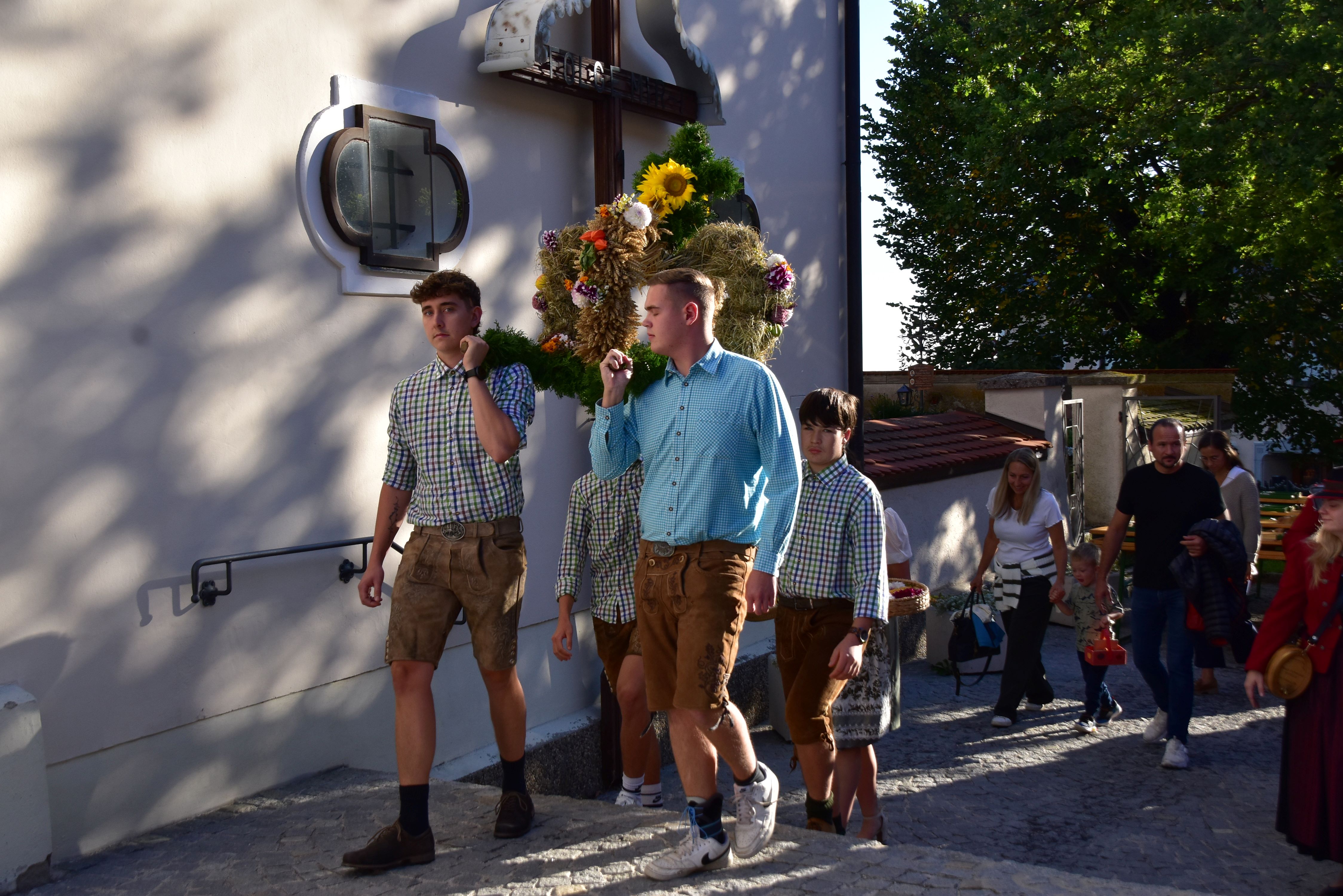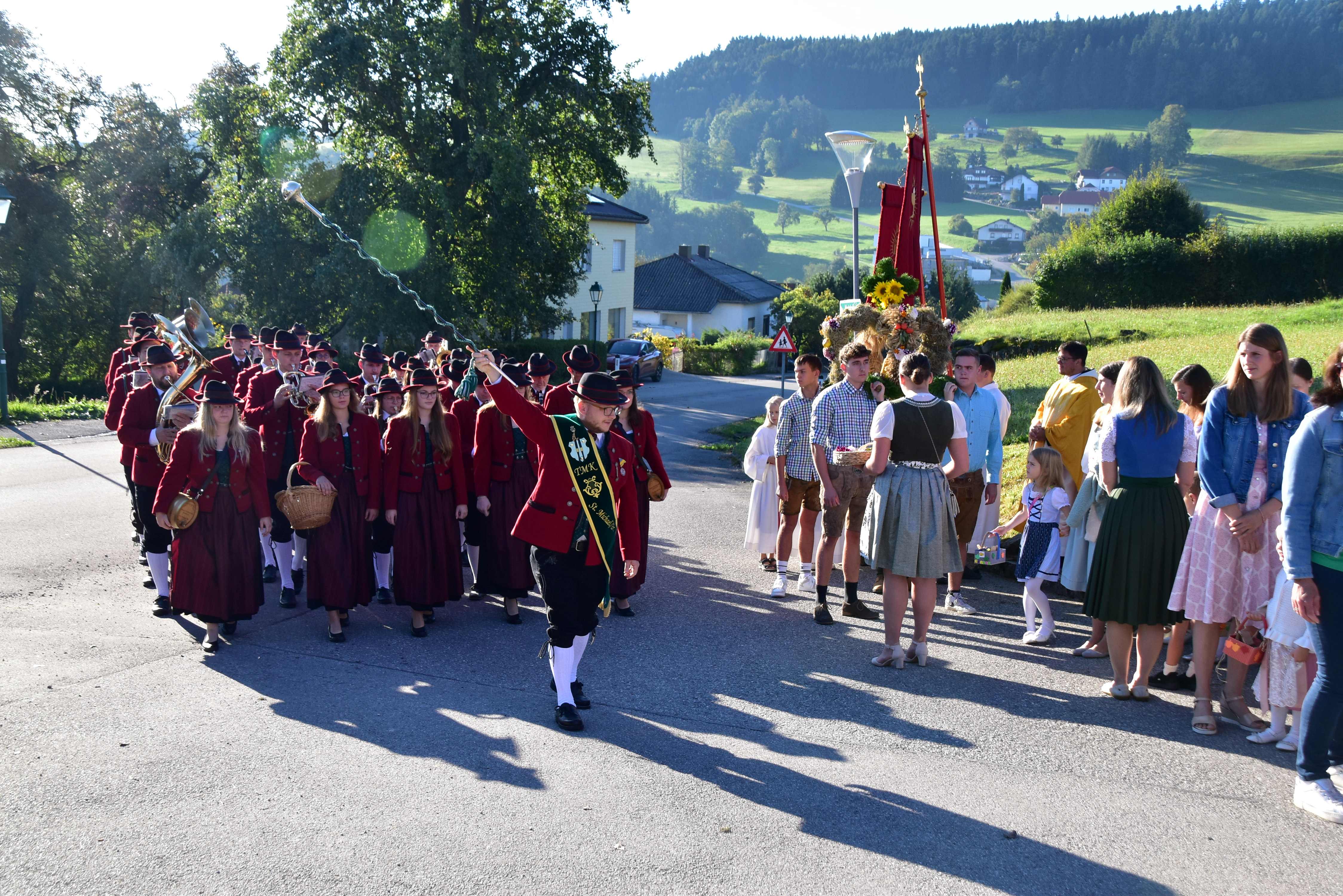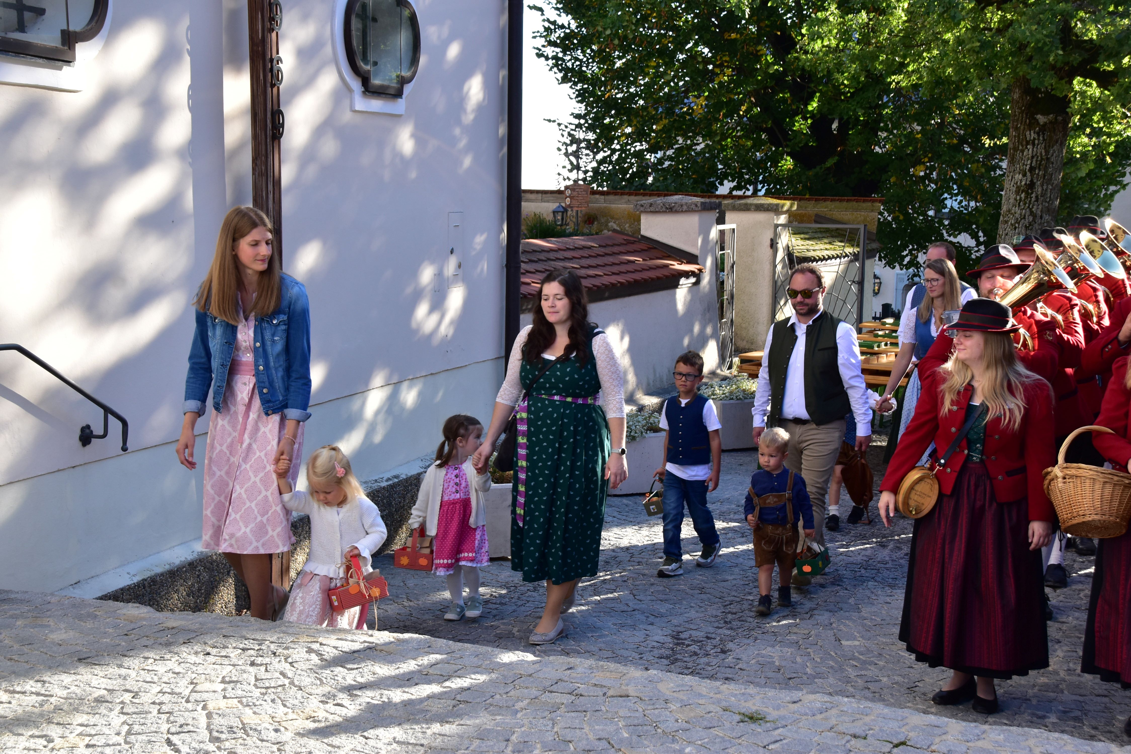 Bei strahlend schönem Spätsommerwetter feierte die Pfarre St. Michael das Erntedankfest. Auf Pater Florian und die von der KLJ wunderschön gebundene Erntekrone warteten bei der Mitterböckkapelle schon viele Messbesucher, darunter auch viele Kinder und die Trachtenmusikkapelle St. Michael, die den Festzug mit der Erntekrone musikalisch in die Kirche begleitete. Die Kindergartenkinder brachten ihre Erntekörbchen zum Altar und beteiligten sich mit dem Lied: "Hast du heute schon danke gesagt?" eifrig an der Hl. Messe.