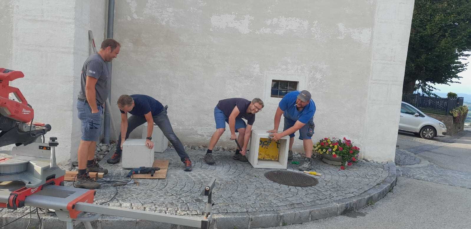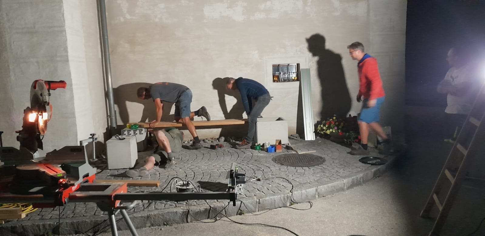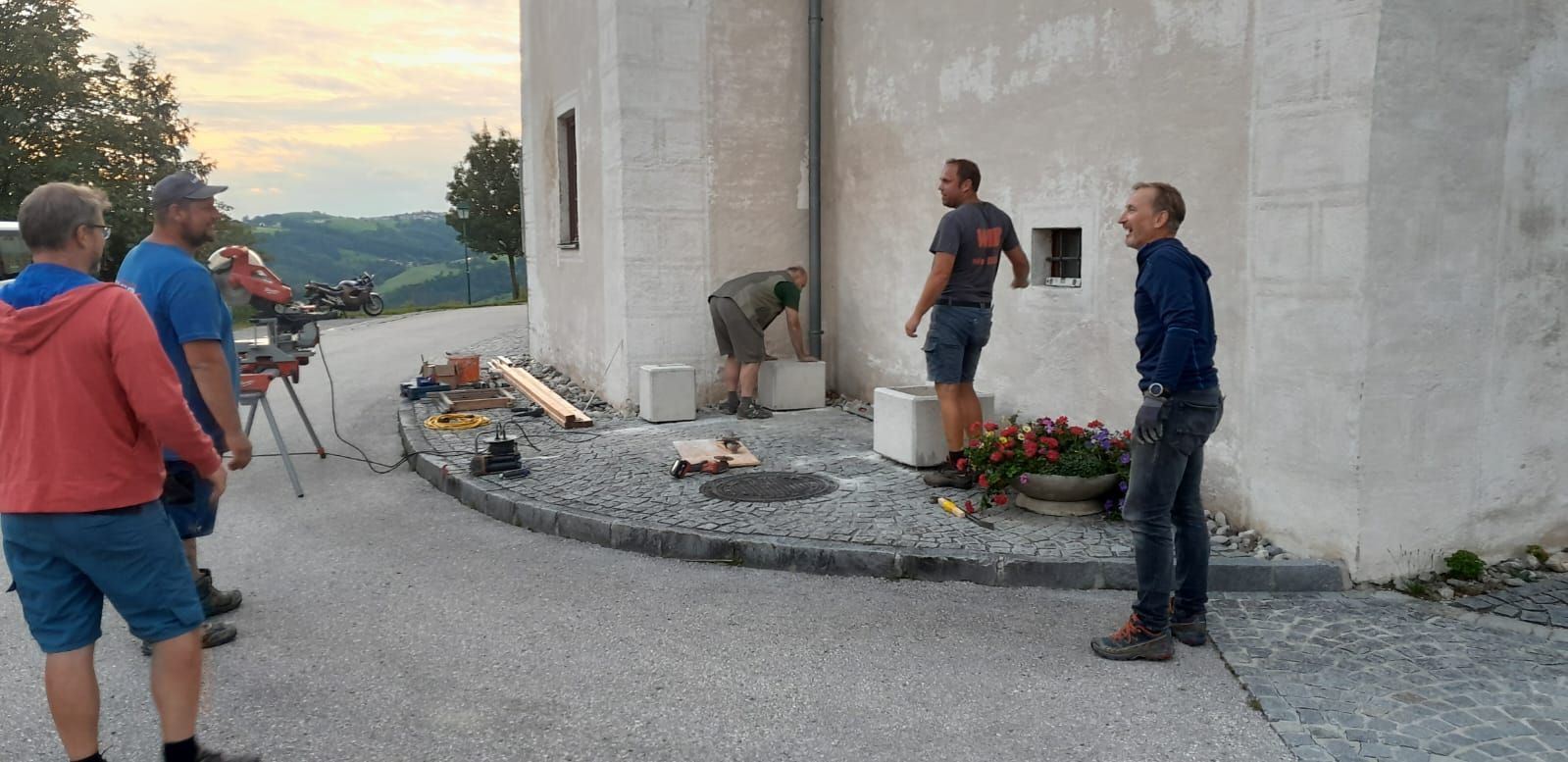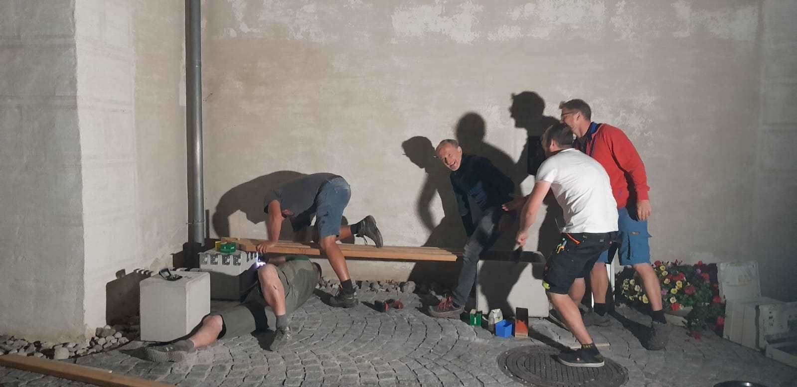 Voller Körpereinsatz war gefragt bei den Bankfachmännern der Dorferneuerung St. Michael, als beim Pfarrhof eine neue Sitzecke angefertigt und aufgestellt wurde.