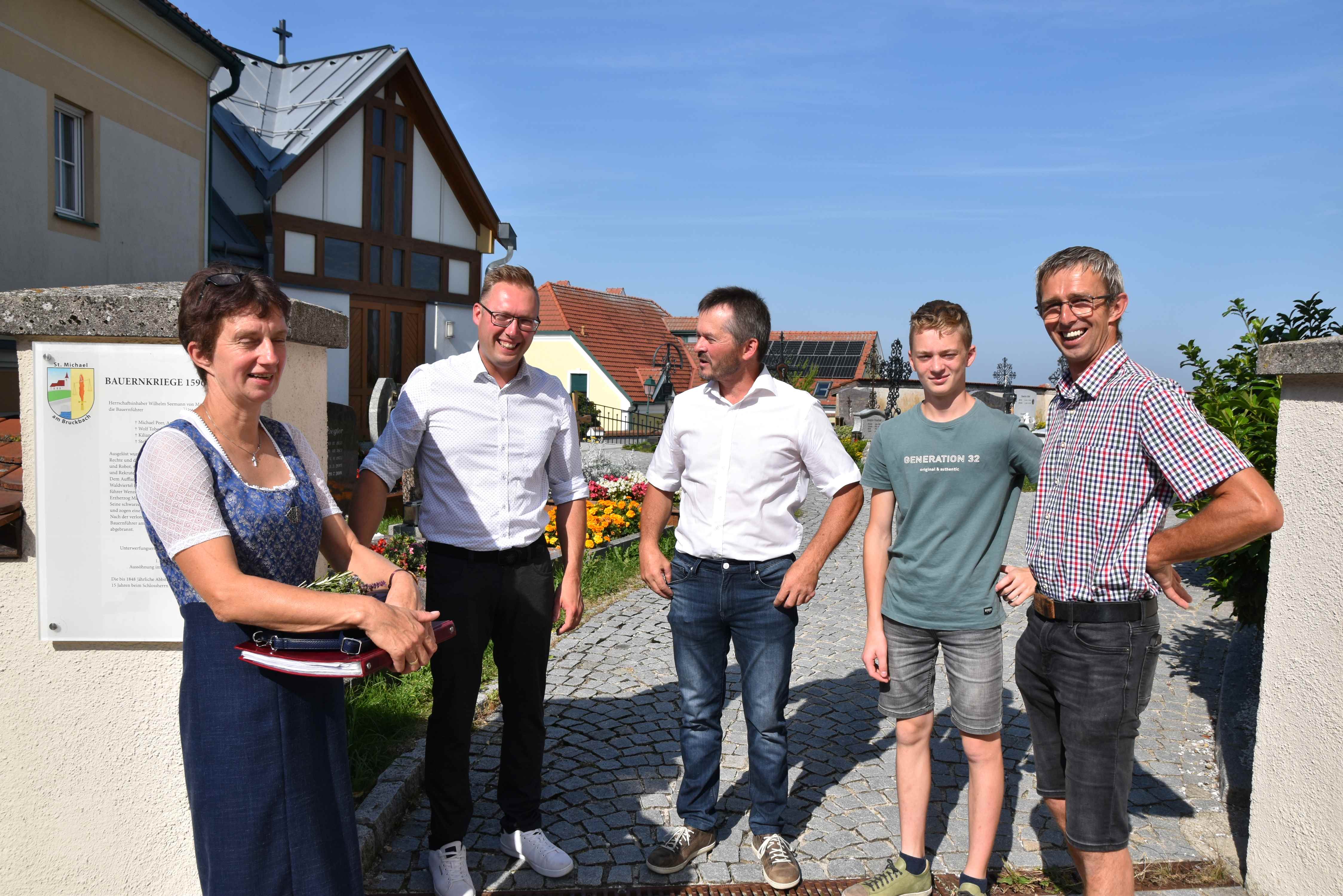 Während der Sommerferien wird der Böschungsbereich umgestaltet und in den bestehenden Spielplatz des Kindergartens integriert. Darüber freuen sich die Kindergartenkinder aus St. Michael mit Kindergartenleiterin Magdalena Jelinek und Betreuerin Claudia Ratzberger sowie Bürgermeister Johannes Heuras, Dorferneuerungs-Obfrau Bianca Hinterleitner, Ortsvorsteher Josef Streißlberger und Gemeinderat Michael Pfaffenbichler