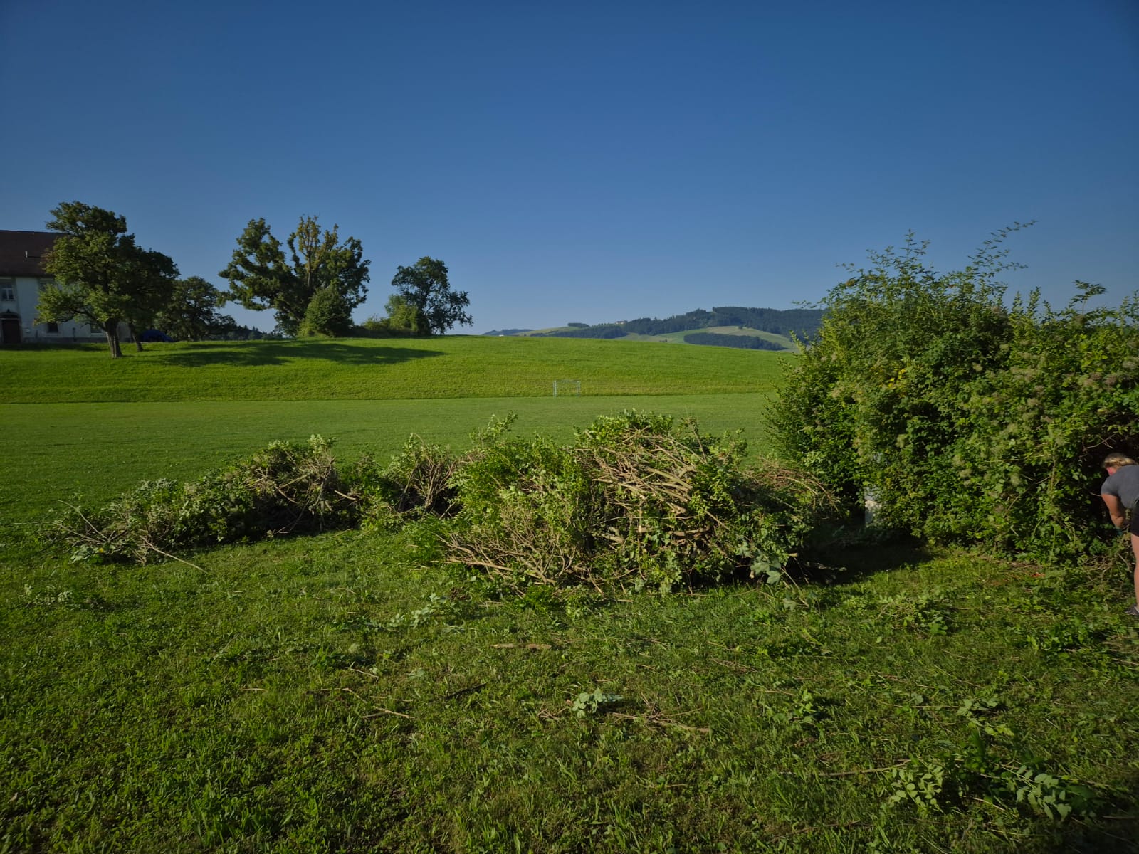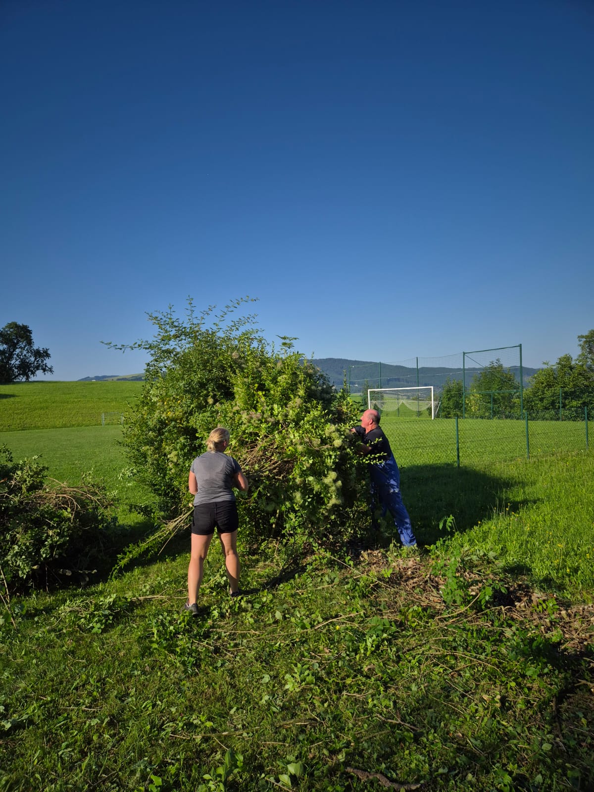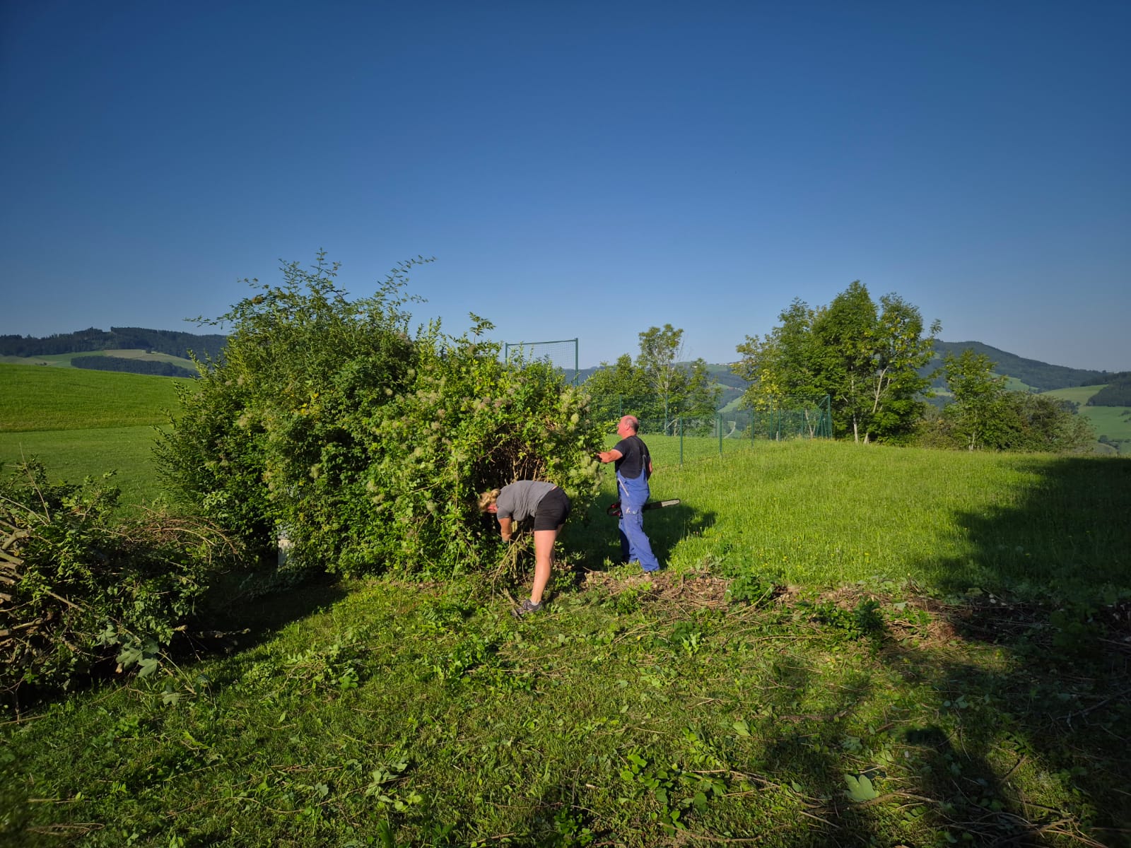 Der Anfang ist gemacht!. Mitglieder der Dorferneuerung, allen voran OV Josef Streißlberger, haben sich am 9.8. früh bei der Kindergartenmauer eingefunden und trotz Sommerhitze mit den ersten Rodungsarbeiten begonnen.