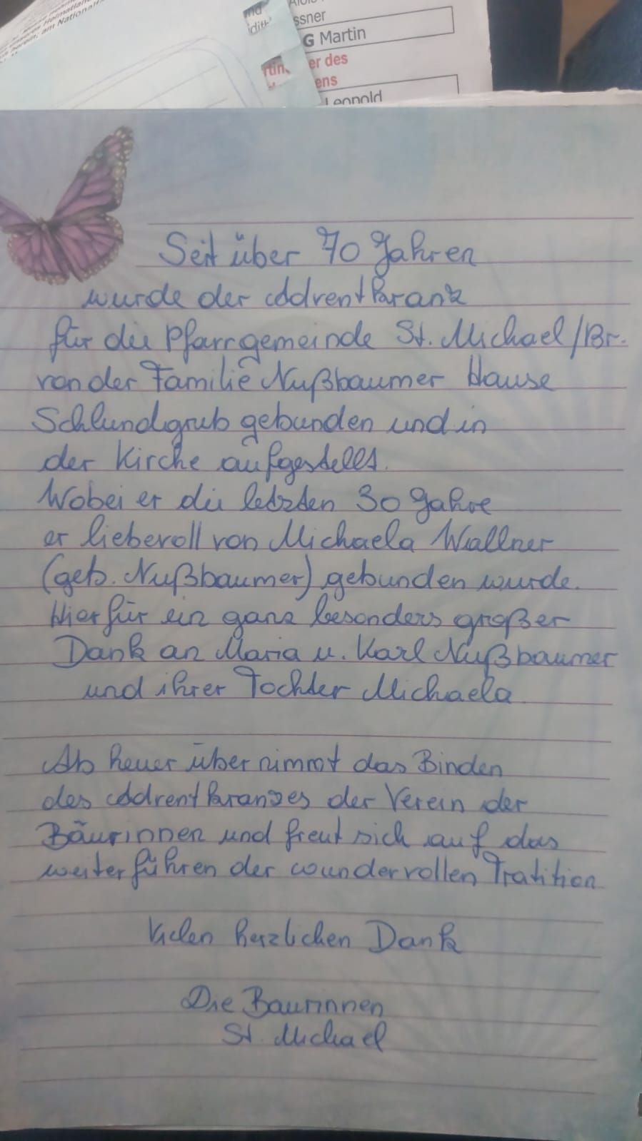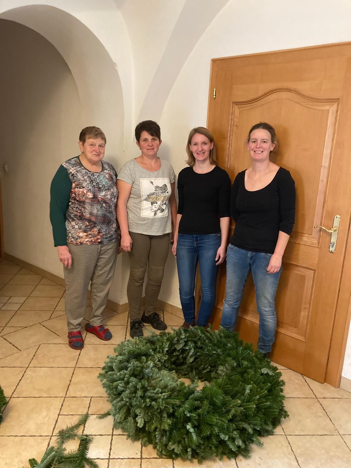 Auch der große Adventkranz in der Pfarrkirche wurde heuer erstmalig von den Bäuerinnen gebunden. In den letzten 70 Jahren wurde diese Aufgabe traditionell im Hause Schlundgrub wahrgenommen, davon in den letzten 30 Jahren von Maria Wallner (geb. Nussbaumer). In einem netten Brief (s. weiter unten) dankten die Bäuerinnen der Familie Nussbaumer für die Aufrechterhaltung dieser wunderbaren Tradition.
