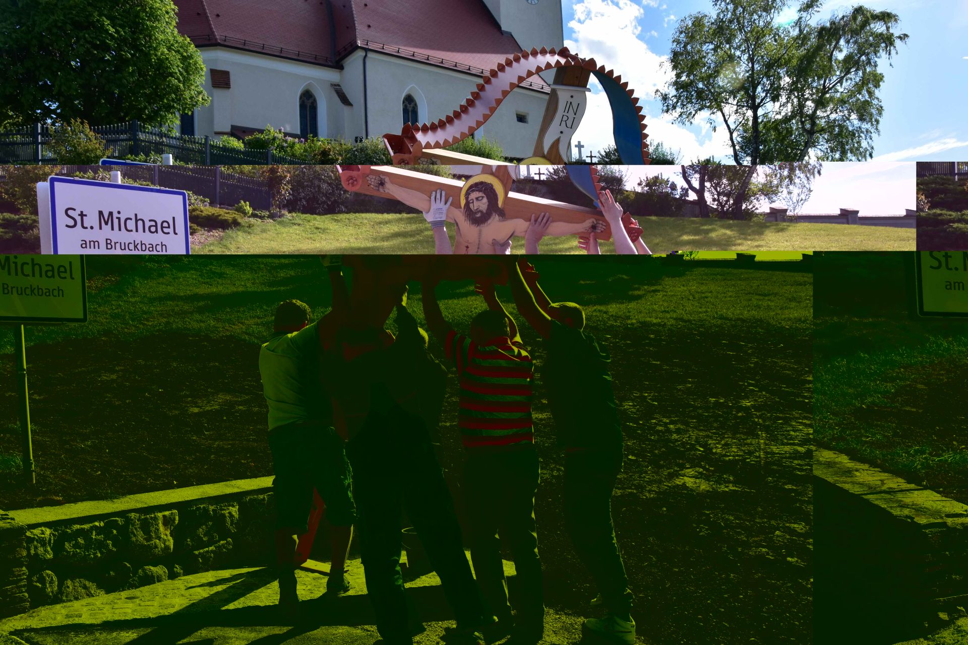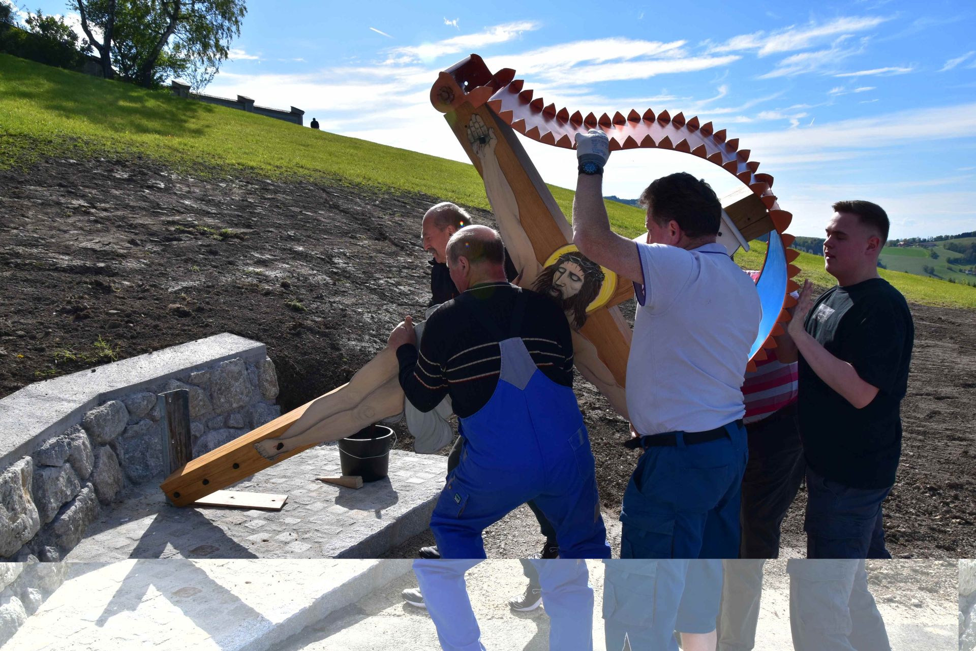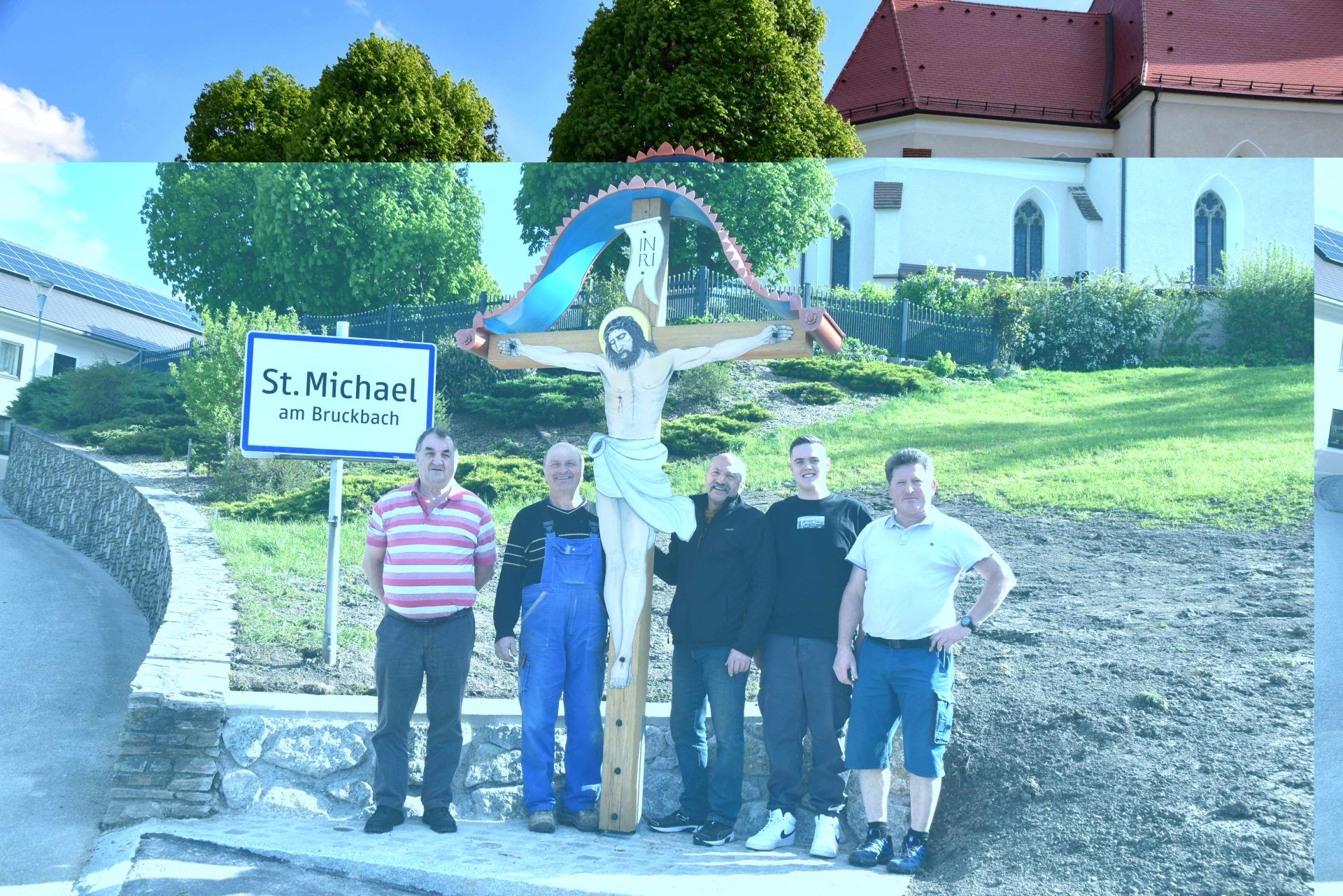 Fünf kräftige Männer waren nötig, um das Kreuz nach seiner Renovierung an seinem neuen Platz wieder aufzustellen, wo es jetzt wieder für viele weitere Jahre als religiöses Wahrzeichen die Ortseinfahrt von St. Michael zieren wird.