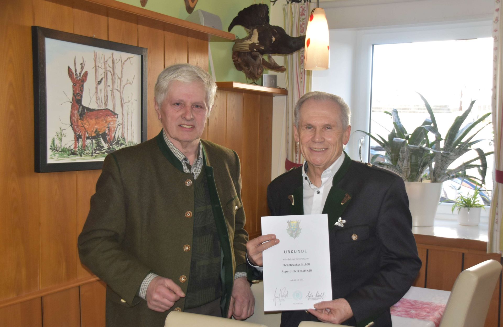 Für seine 40-jährige Mitgliedschaft beim NÖ Landesjagdverband erhielt Rupert Hinterleitner den Silbernen Ehrenbruch. Die Auszeichnung wurde durch Jagdleiter Franz Wimmer überreicht.