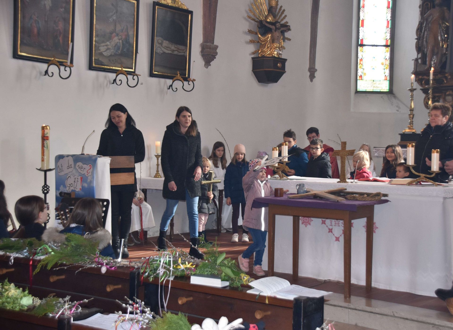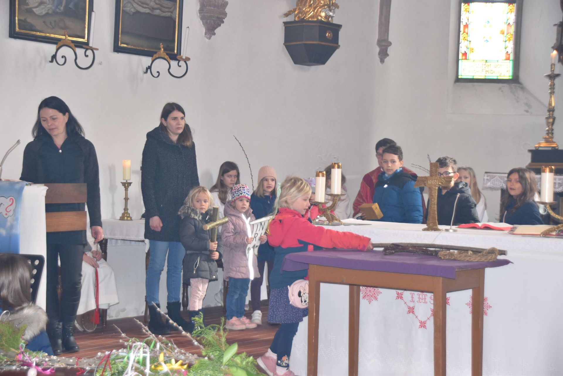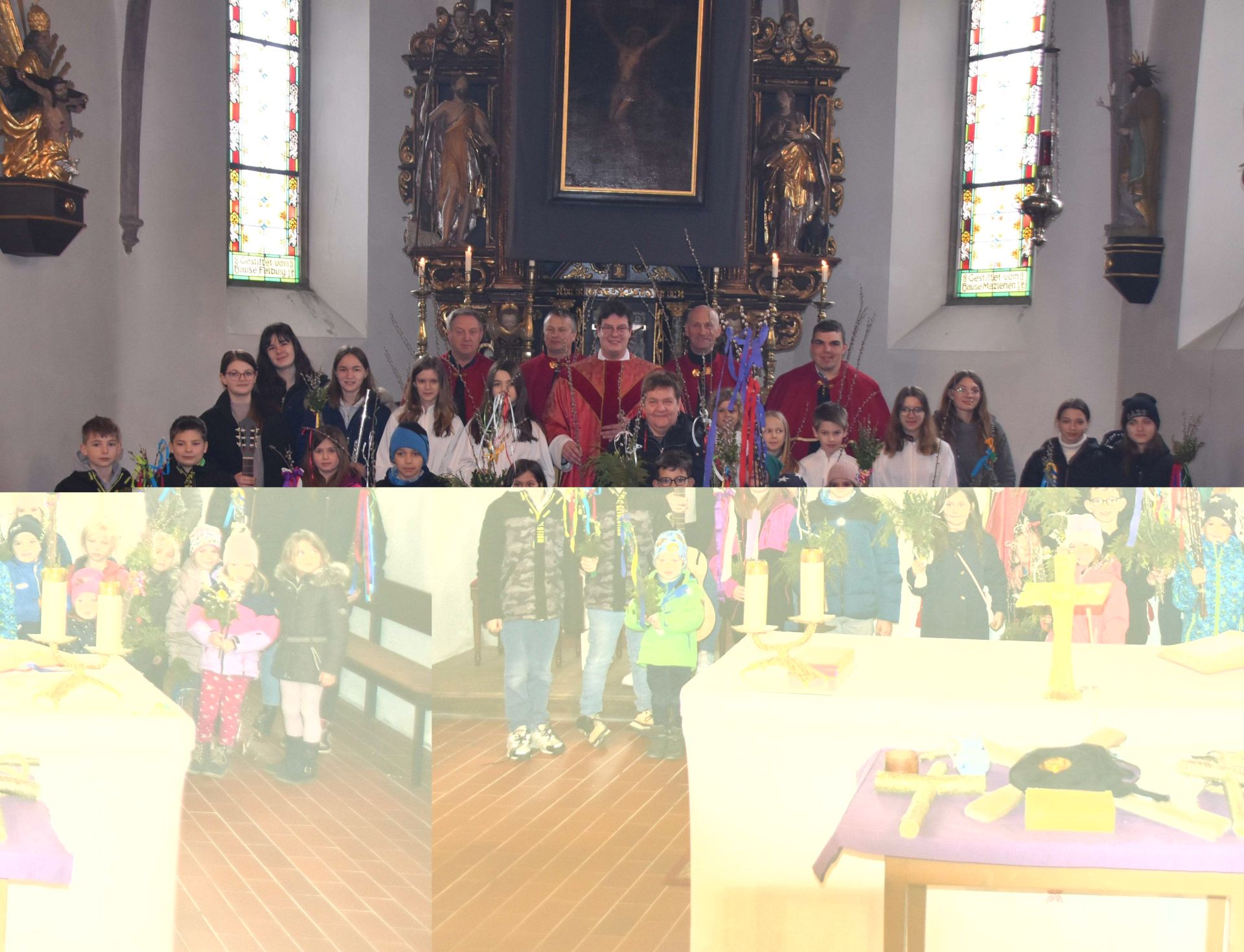Viele Kinder waren mit ihren Eltern zur festlichen Palmsonntagsmesse gekommen und haben geschmückte Palmbuschen mitgebracht. Von einigen Kindern wurde anschaulich das Leiden und Sterben Jesu Christi dargestellt, Michöner Jungmusiker sorgten für die musikalische Begleitung. Die liebevoll nach traditioneller Art gestalteten Buschen wurden von Pater Christoph Fischer geweiht und als Segensbringer für Hof, Feld und Flur wieder mit nach Hause genommen.